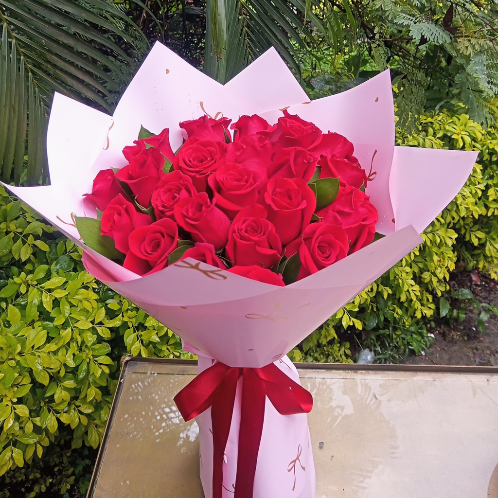 Clásico, romántico y perfecto para cualquier ocasión. Este hermoso ramo de 24 rosas frescas lleva el detalle ideal para sorprender sin gastar de más.